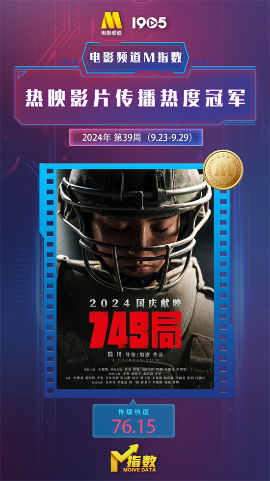 近日,2024年第39周结果新鲜发布。9月23日-9月29日,电影频道M指数热映影片传播热度榜前6位依次为: