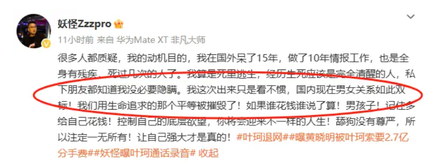 妖怪第二天还发文称“退网加已经确认分手。”