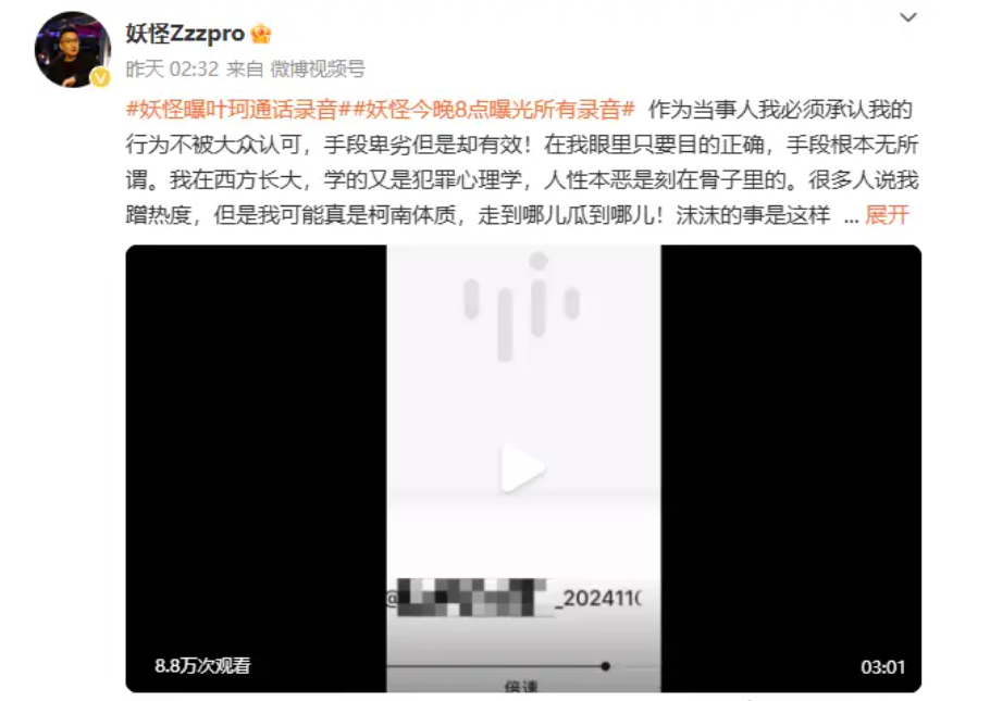 有网友说:“博主妖怪整天在网上吐槽叶珂博流量,人品太差了!”