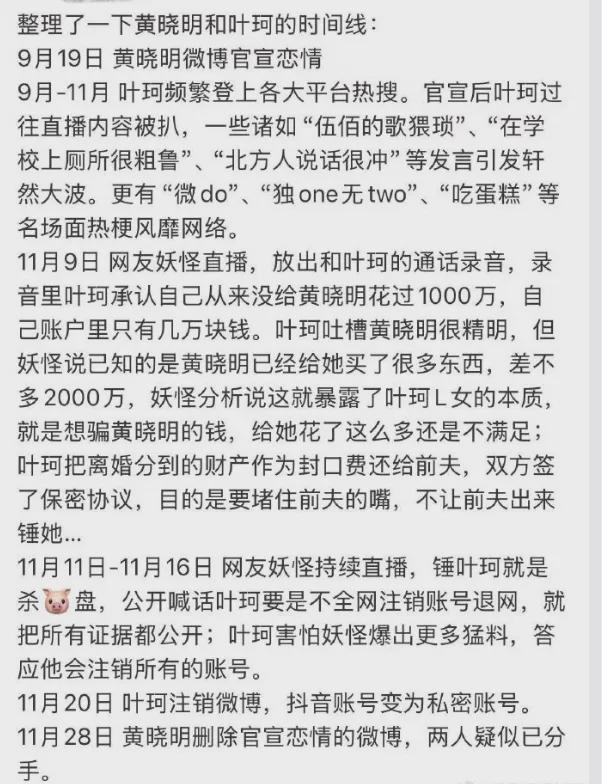 11月28日,黄晓明在微博上删除了与叶珂官宣恋情的微博。