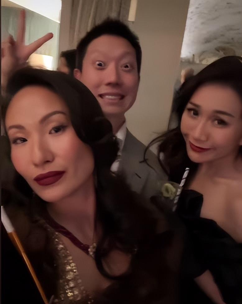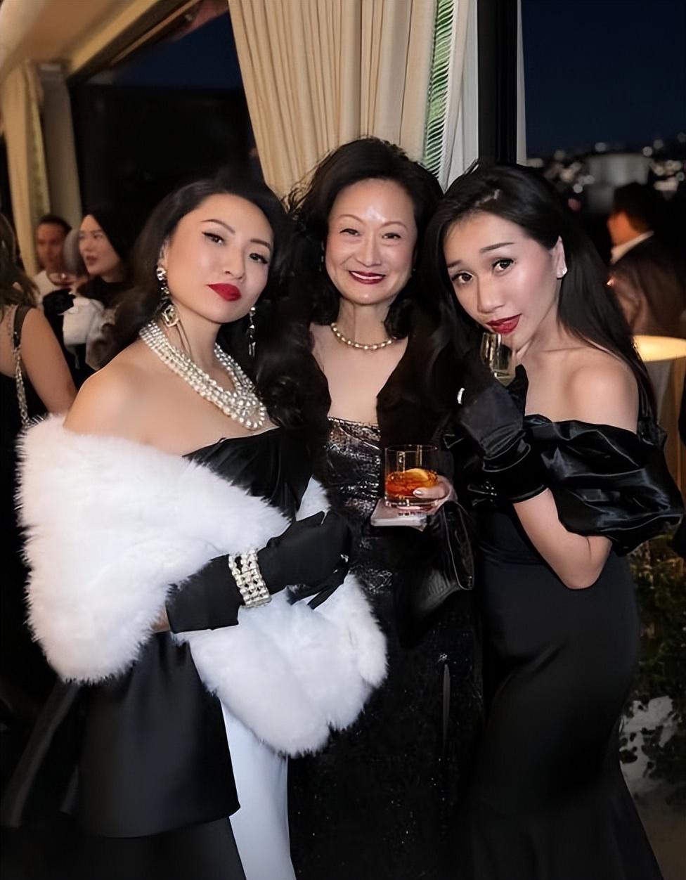 手举香槟的何超盈当晚穿着露肩黑裙,戴着黑色女士手套的她好有贵气,合影的闺蜜挚友也都是香港的贵族名媛。