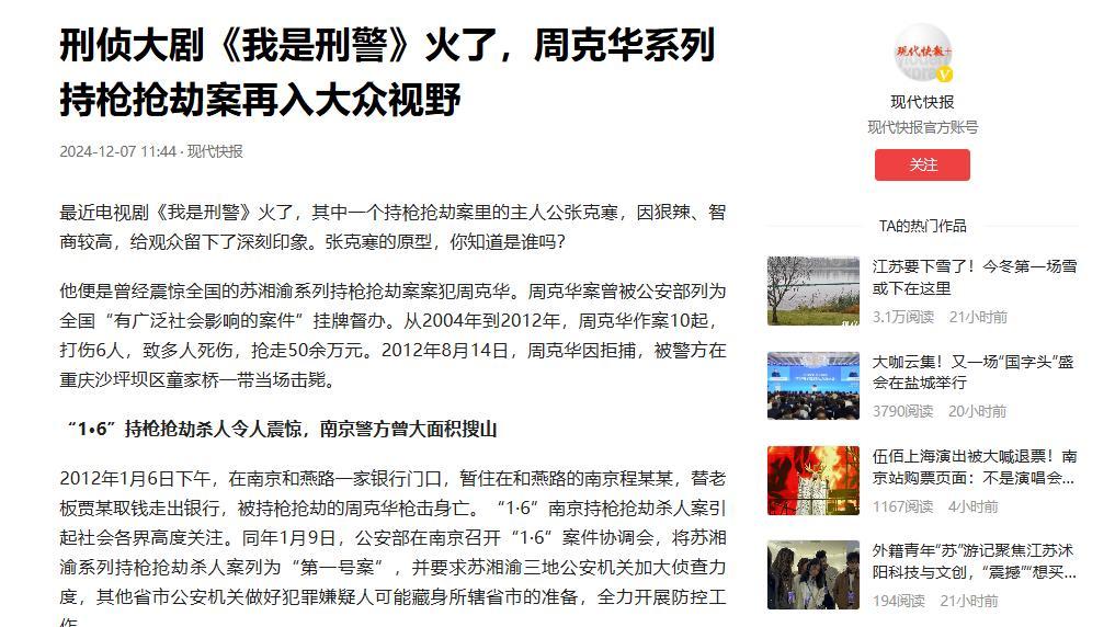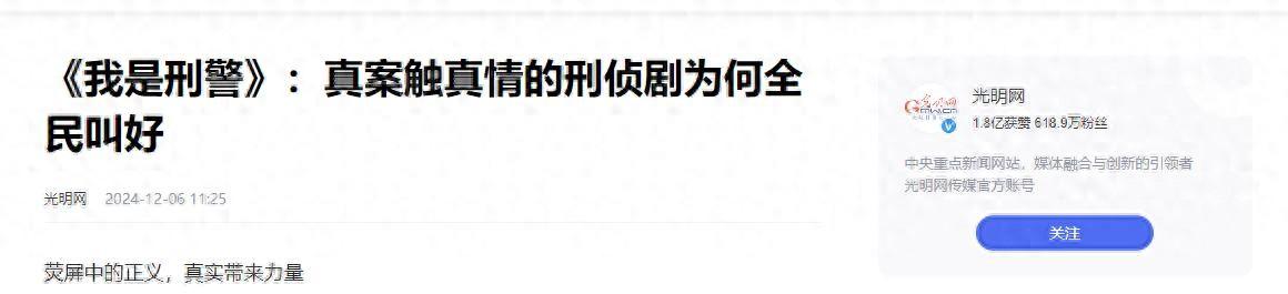 光明网《《我是刑警》:真案触真情的刑侦剧为何全民叫好》澎湃新闻《《我是刑警》:既朴实无华,也与时俱进》现代快报 刑侦大剧《我是刑警》火了,周克华系列持枪抢劫案再入大众视野