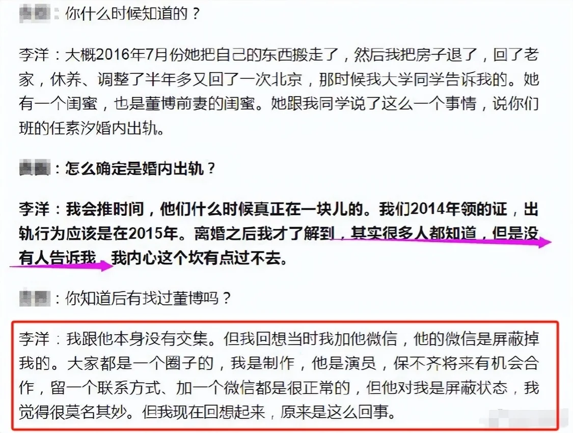直到 2016 年,李洋与任素汐的婚姻破裂,两人离婚,这时李洋才意识到任素汐与董博的关系可能早在 2015 年就已经开始。