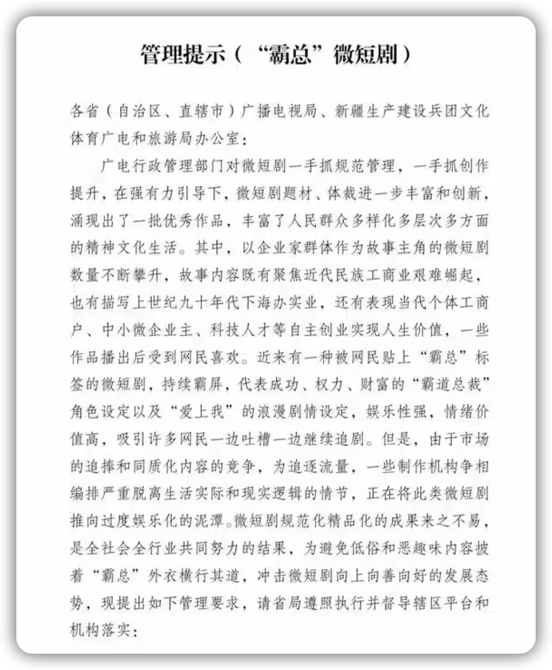 首先是上个月,广电总局网络视听司发布了一则针对「霸总」微短剧的管理提示。