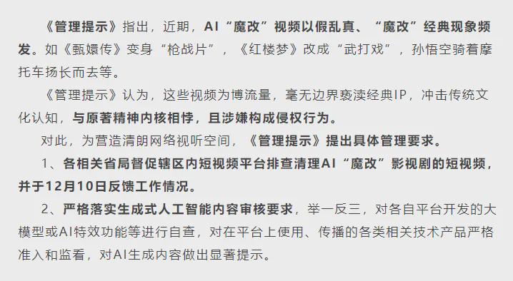 12 月 7 日,广电总局又发布了一则针对「AI 魔改」微短剧的管理提示。