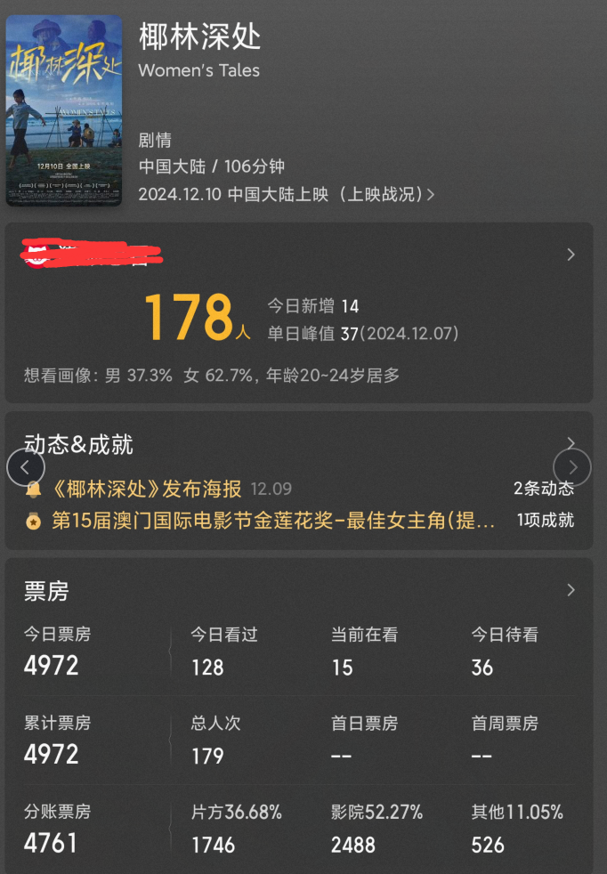 截止12月10号19点,电影上映首日票房仅4972元,你没有看错就是不到5000块钱,如果除去电影院分成和交税,电影片方就分到了不到2000块钱。