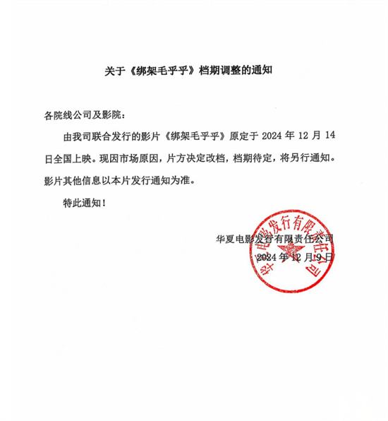 12月10日,电影《绑架毛乎乎》发布声明,称因市场原因改档,目前具体档期待定。