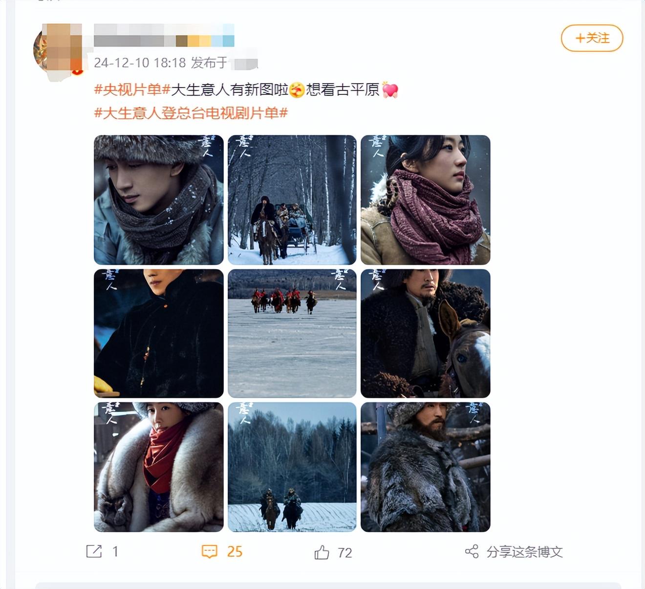昨天官方刚刚放出新一组剧照,在冰雪覆盖的苦寒之地,貂帽裘衣加身的生意人踏雪而来,这股坚韧不拔的精神让人敬佩。