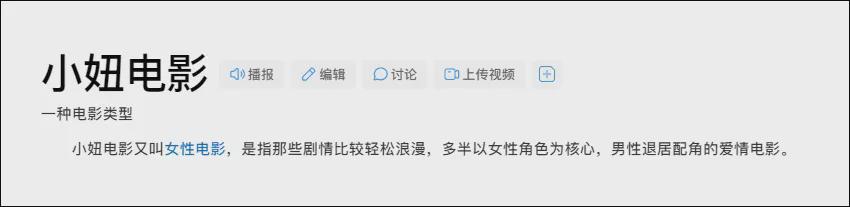 而维基说:“小妞电影”(英语:Chick Flick)是一种俚语,指的是专门迎合女性兴趣、针对女性群体行销的电影类型,主要围绕爱情和浪漫展开情节。