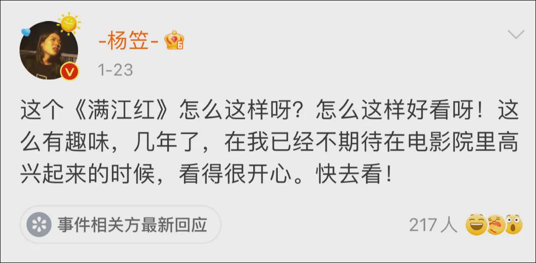 去年,杨笠就因为公开表达对电影《满江红》的喜爱而遭到网暴。
