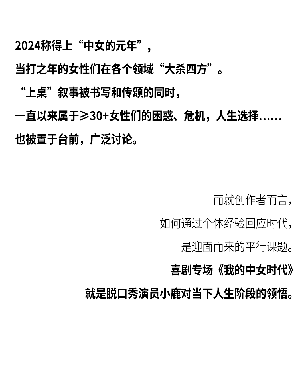 喜剧演员的自我觉察具有相当的即时性。所谓一岁一礼,《我的中女时代》正是在30岁那年开始的创作和累积。关于“中女”,小鹿认为仅以年龄划分有点粗暴,她更愿意从生命经验的维度给出定义和解读。