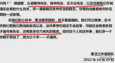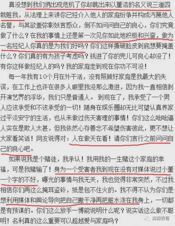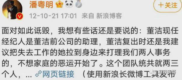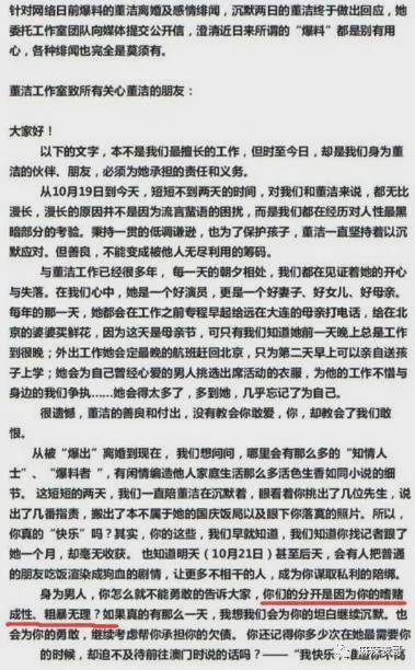 大意就是董洁是好演员、好妻子、好女儿、好妈妈,潘粤明烂赌成性、粗暴无理,那些梁朝伟、陈坤、王大治等先生,是潘粤明杜撰出来抹黑董洁的。