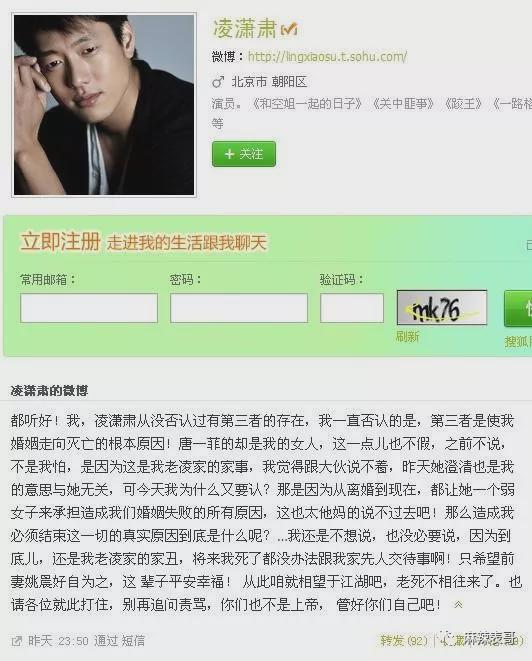 那个时候还有搜狐微博,凌晨,凌潇肃在上面用短信发布,说“我,凌潇肃从没否认过第三者的存在”,还表示“唐一菲的确是我的女人”,至于自己为什么离婚,凌潇肃说是“老凌家的家丑”。