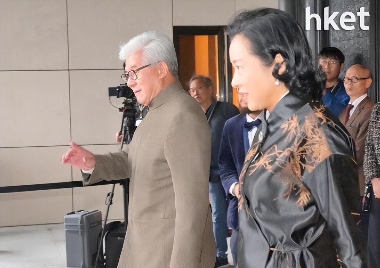 罗康瑞当天提着庆祝礼物和老婆朱玲玲共同现身,75岁的罗康瑞满头白发,银发气质状态好。