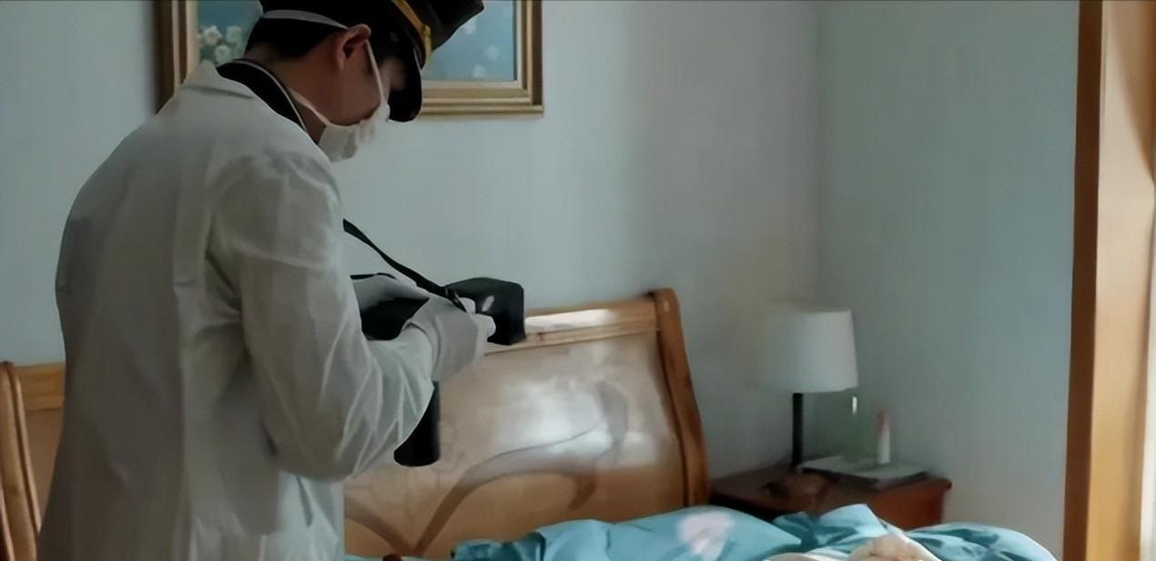 当时,一位警察正在卧室里拍摄照片,我们可以看到,床上的四件套是蓝色并且带有白色云朵的。