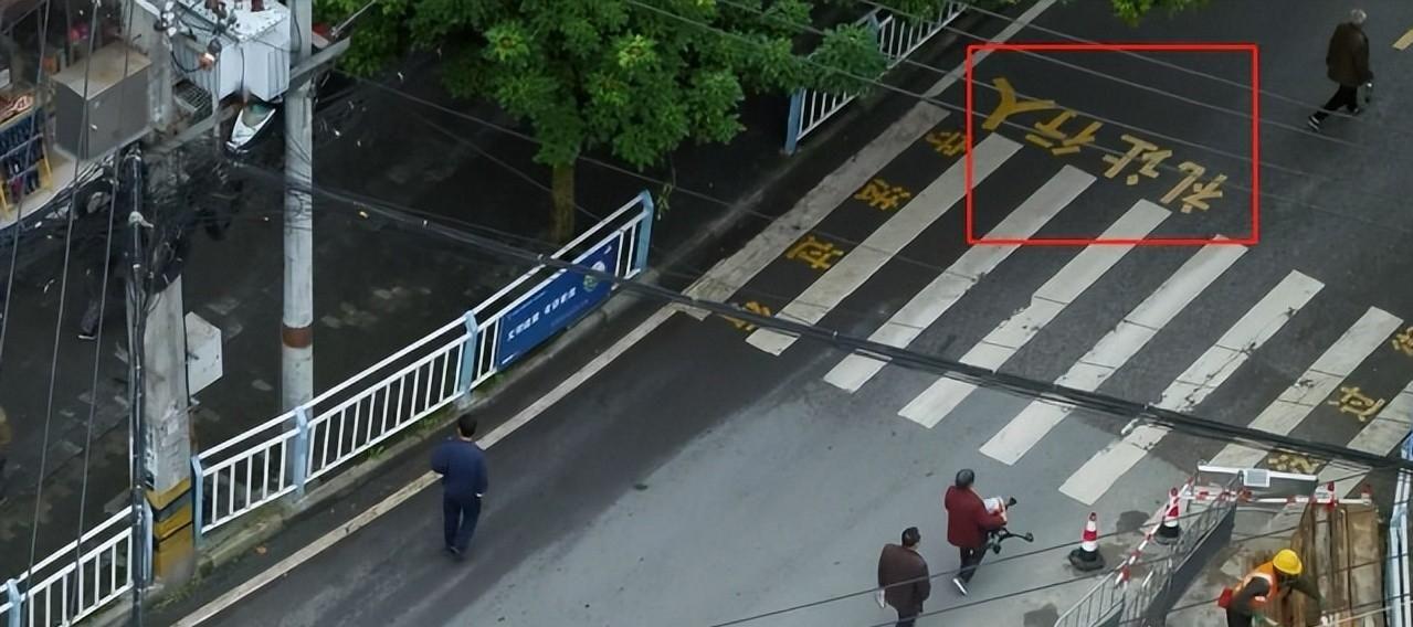 在他前面是一条斑马线,斑马线旁边竟然标着“礼让行人”几个字。
