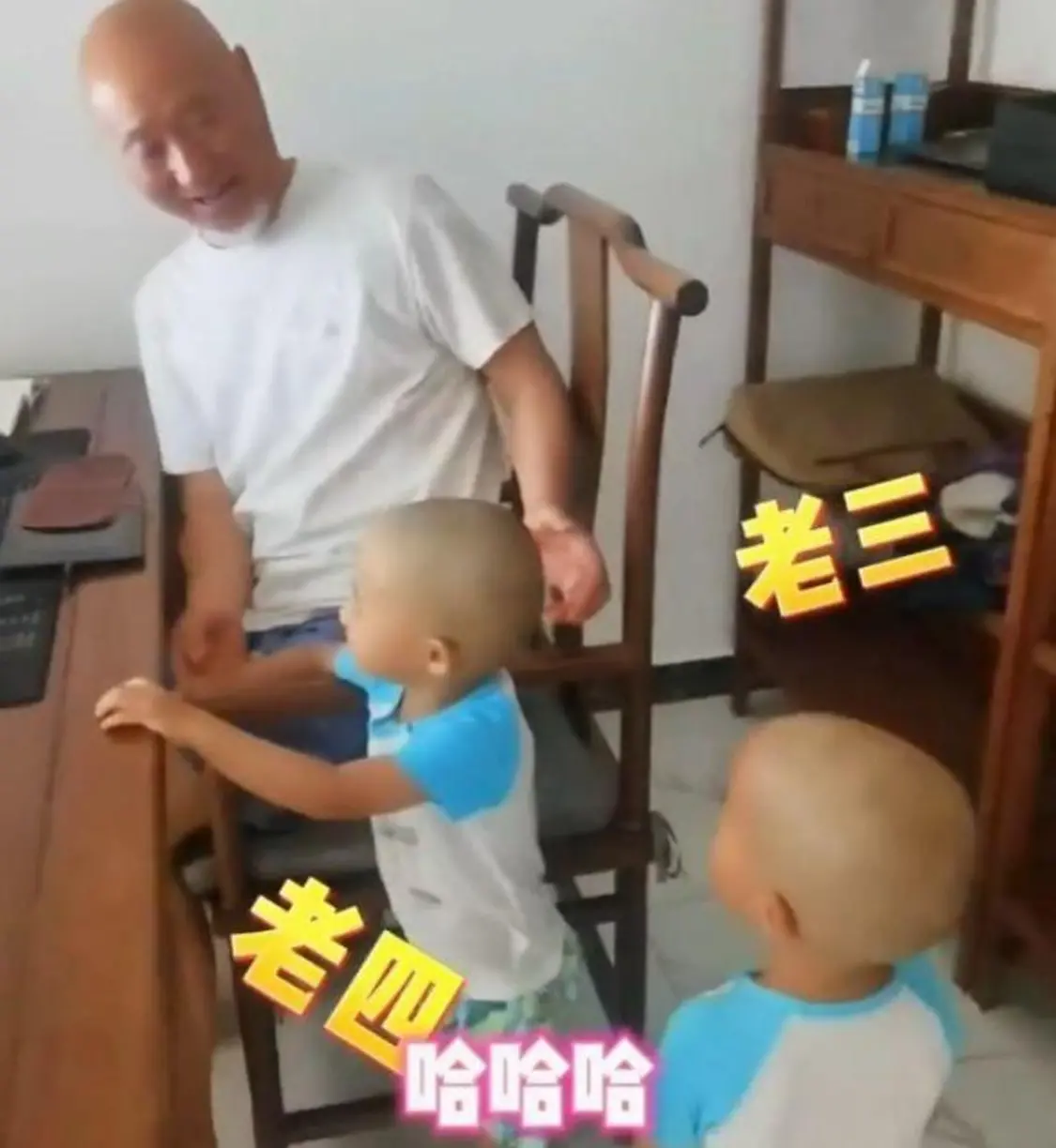 如今的他,已经过上含饴弄孙的生活。