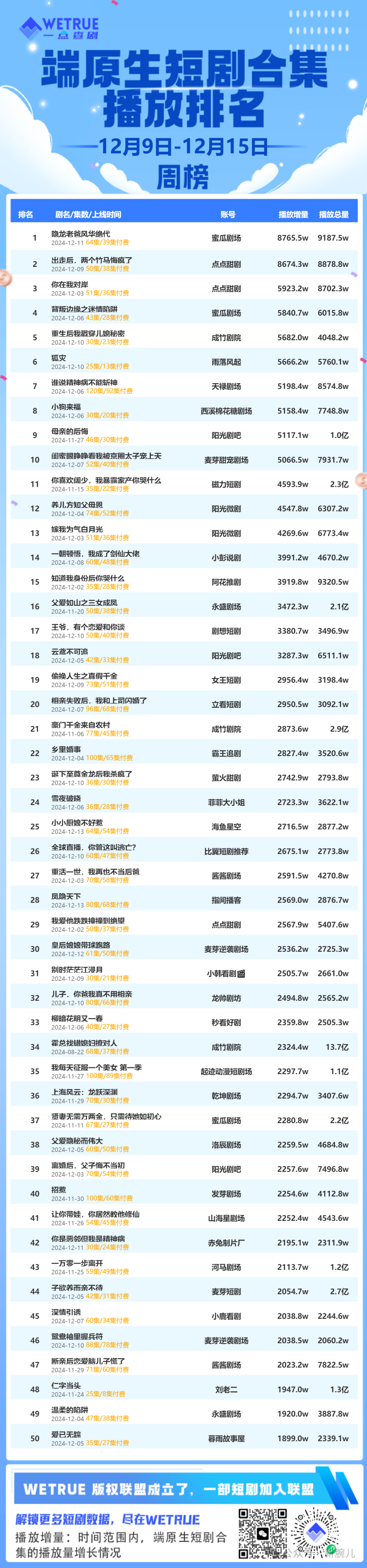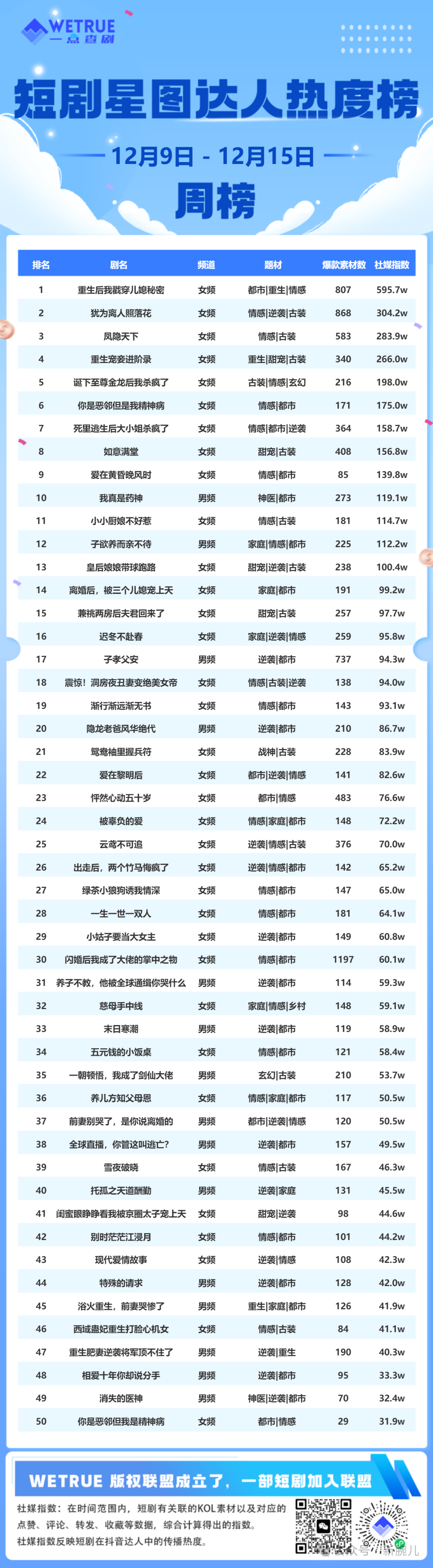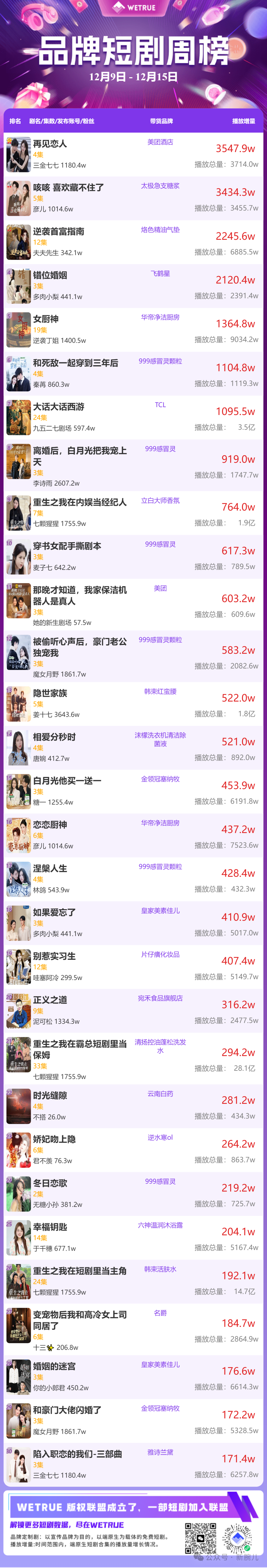 12月16日,新腕儿、鞭牛士联合WETRUE一点查剧共同推出12月第2周短剧热度周榜、短剧星图达人热度榜、端原生短剧榜和品牌短剧周榜。