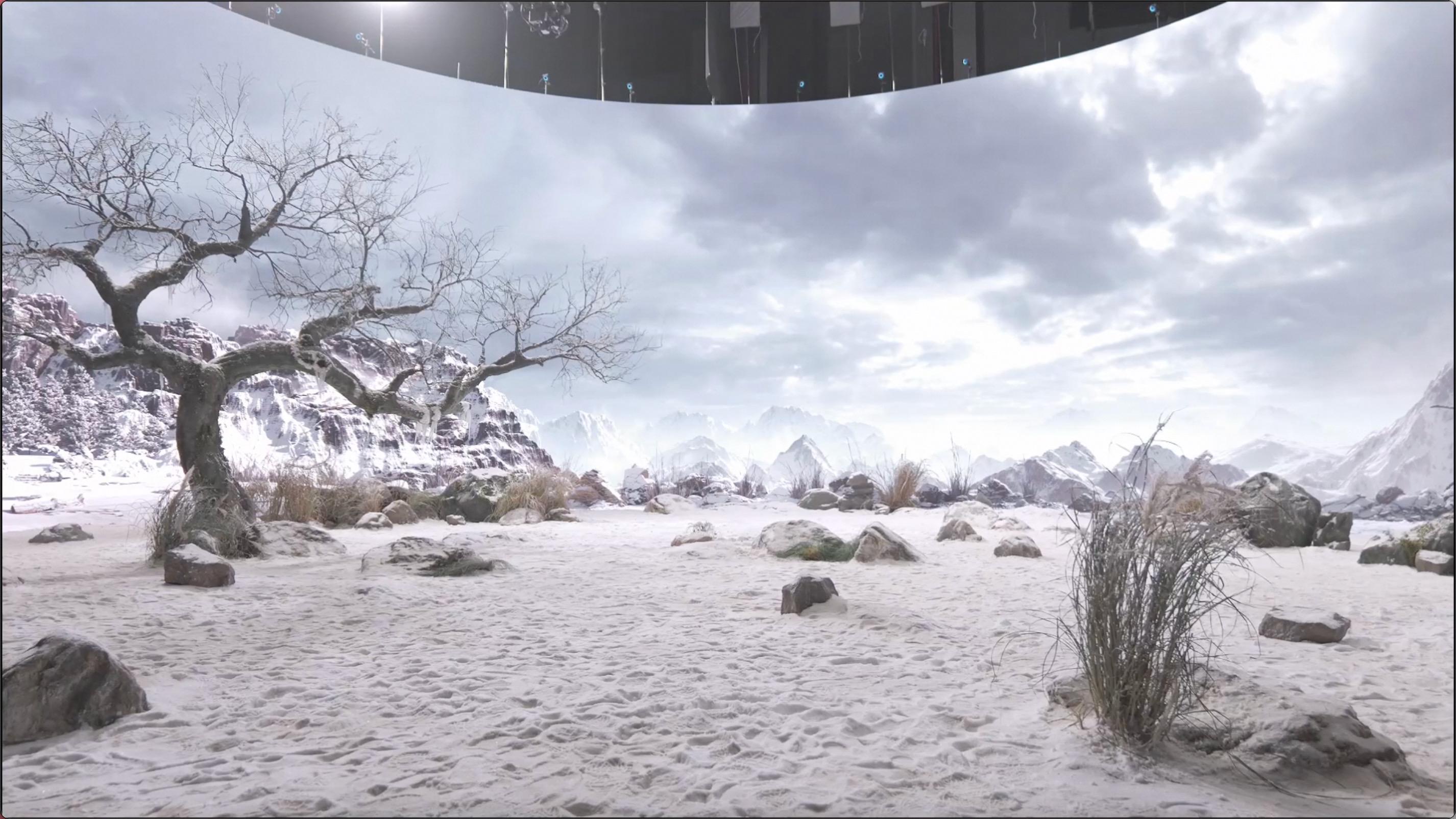 乍一看到这幅雪景图,许多人会认为这是真实存在的场景。实际上,这是一个“半真半假”的场景——前面的雪地、石块和荒草是真实布景,后面绵延起伏的山峦则是LED屏呈现。