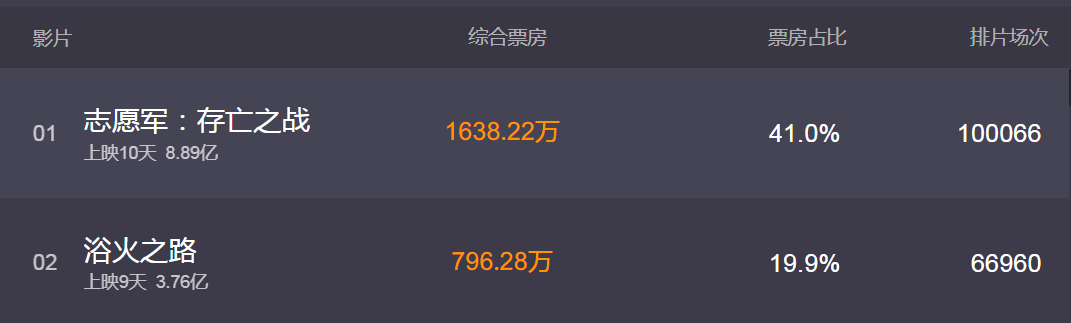 除了最大体量的《志愿军》,《浴火之路》可以说后来居上,在《749局》因口碑下行的间隙,实现反超——9天3.76亿,票房成绩不俗。