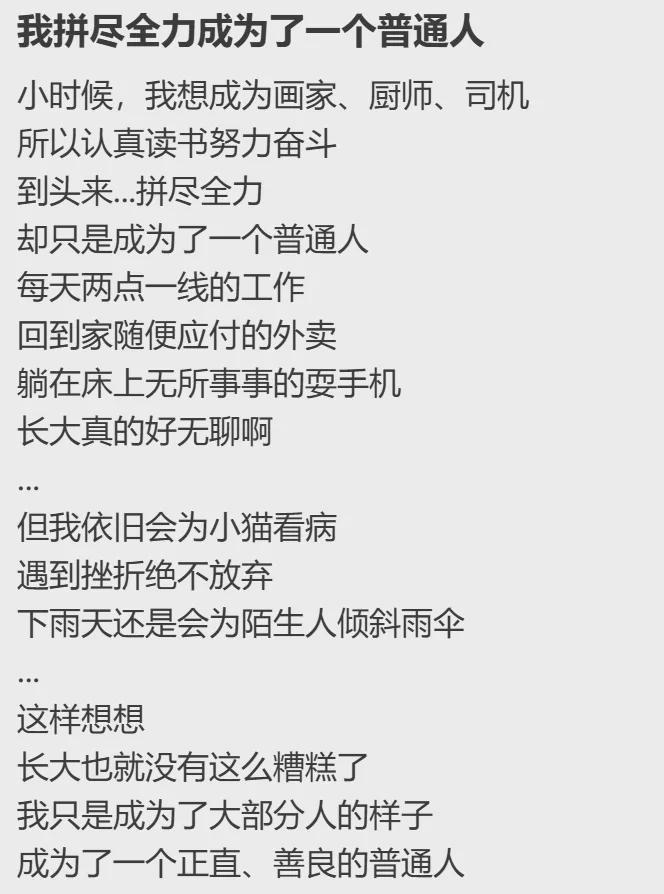“小时候,我想成为画家、厨师、司机,所以认真读书努力奋斗,到头来...拼尽全力,却只是成为了一个普通人。”