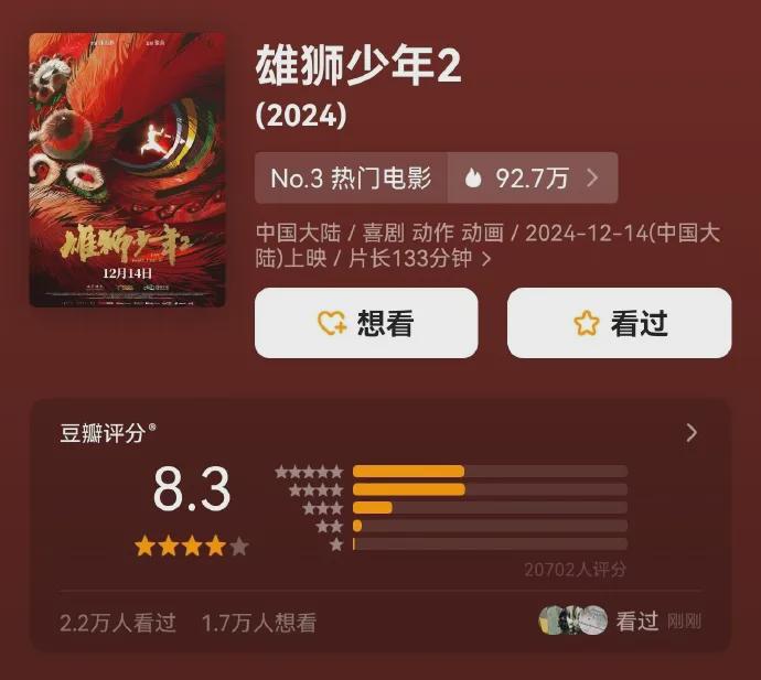 《雄狮少年2》周末上映了,豆瓣评分8.3,可谓备受好评。