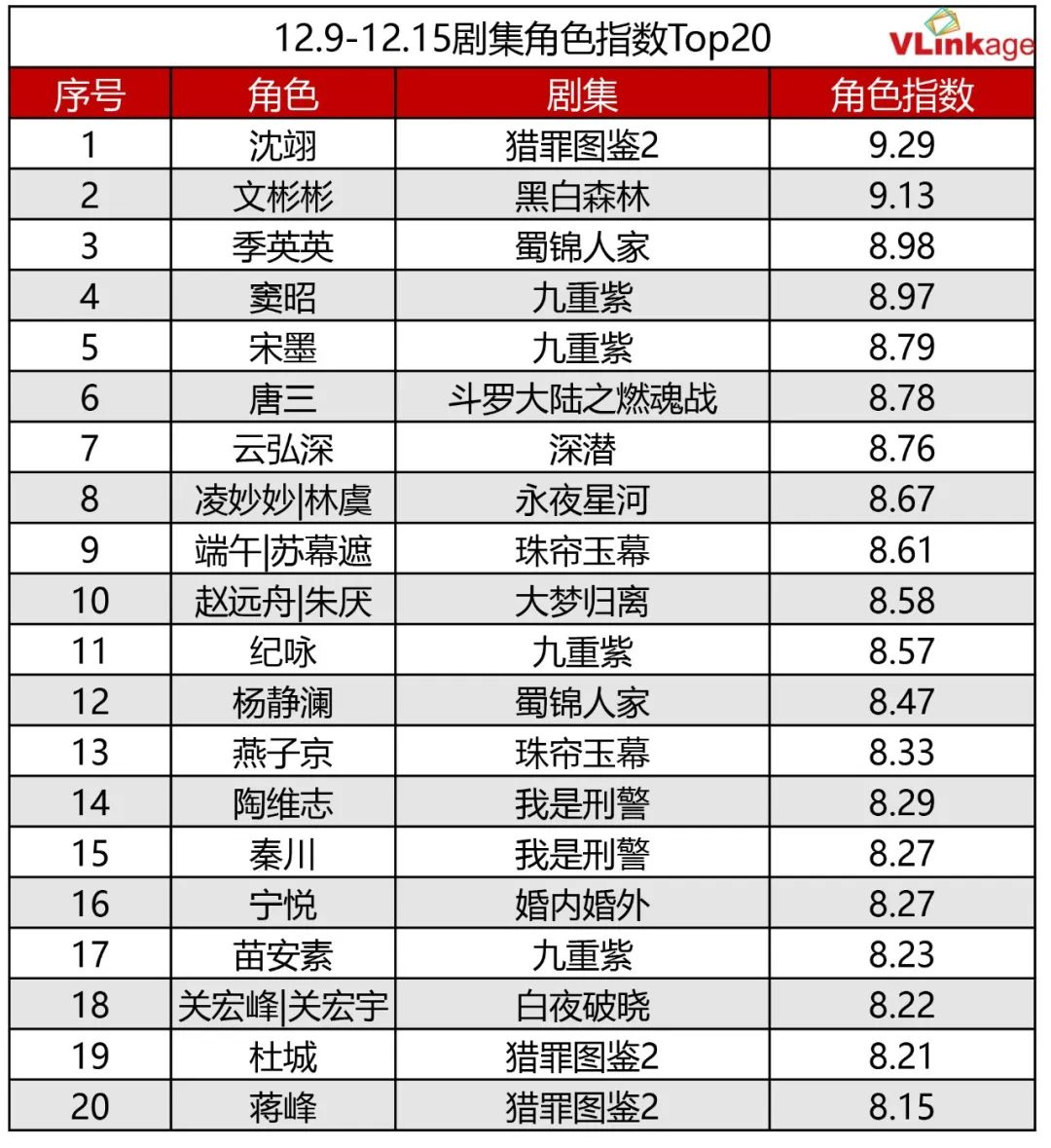 下图为上周剧集角色指数Top20,来自新剧《猎罪图鉴2》的男主沈祤在该剧开播后快速空降榜首,在全网有着较高关注度。《黑白森林》男主文彬彬同样是上周受众认知度较高的角色。这两位来自刑侦剧的男主,是上周人气最高的角色。