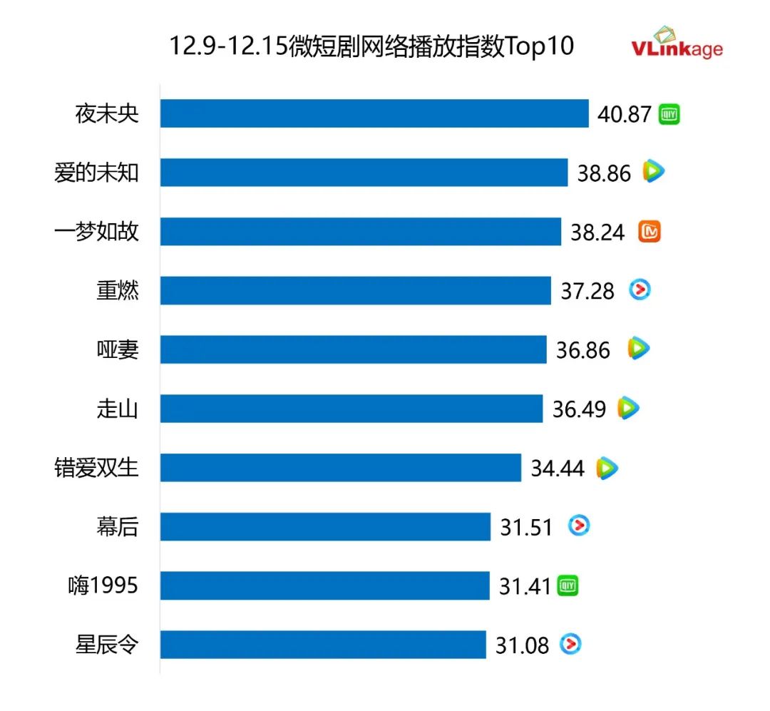 下图为上周微短剧网播指数Top10,《夜未央》和《一梦如故》均延续了上上周的热度表现,受到短剧用户欢迎。上周新剧《爱的未知》首周表现不错。