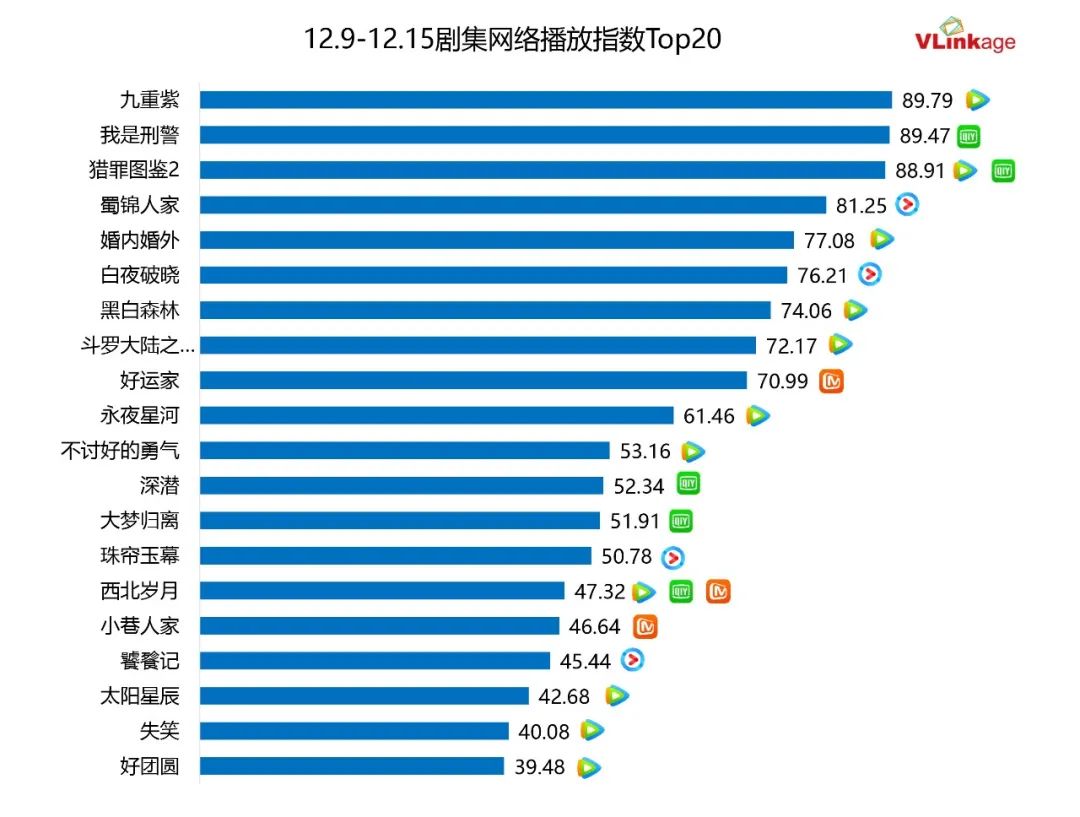 下图为上周剧集网播指数Top20,热度最高的剧集分别为古偶剧《九重紫》,以及两部刑侦剧《我是刑警》和《猎罪图鉴2》,网播指数均在88 ,这三部作品撑起了上周剧集市场的热度。古偶剧《蜀锦人家》上周热度也表现亮眼,稳定保持在80 。