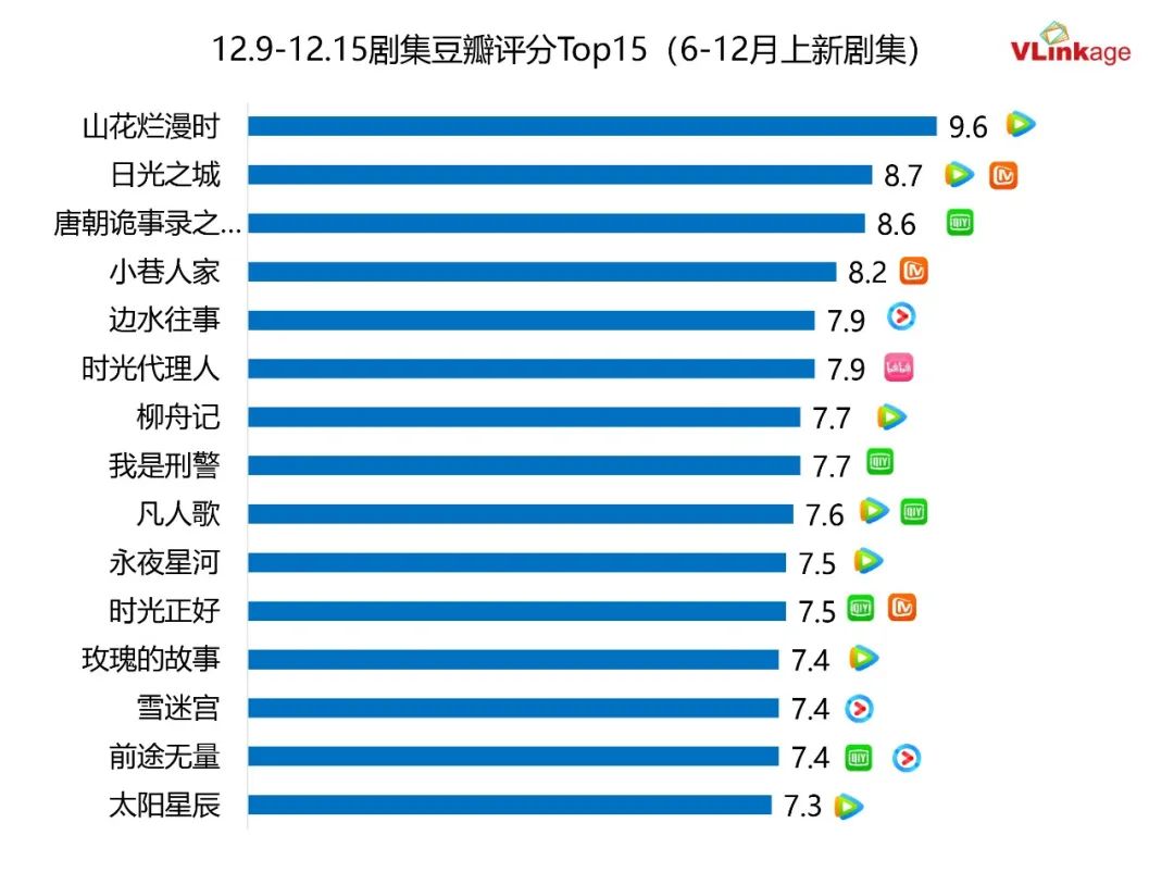 下图为上周6-12月剧集豆瓣评分Top15,上榜作品和上上周基本一致,依然只有4部作品豆瓣评分在8分以上。虽然从11月开始,各大平台大量排播悬疑剧,但这些作品陆续出分后,豆瓣评分均在7分 ,2024年还有两周,目测今年高口碑剧稀缺的态势已成定局。
