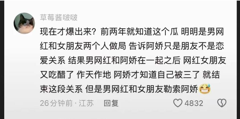 有知情人士透露说,【两年前就知道这件事了,其实是余衍隆和女友做局坑了阿娇。当时余衍隆说自己单身,骗阿娇刷了不少钱。结果余衍隆和阿娇频繁来往之后,女友又各种吃醋,作天作地,阿娇知道后就分手了。他俩后来还联手勒索过阿娇。】