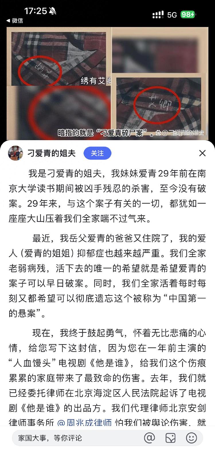 12月17日,网名为“刁爱青的姐夫”的网友在社交媒体发文称,电视剧《他是谁》出品方打着“南大碎尸案”原型案件的宣传旗号,于2023年3月开播,斩获多项电视剧大奖,但却给家属带来巨大的打击和伤害。