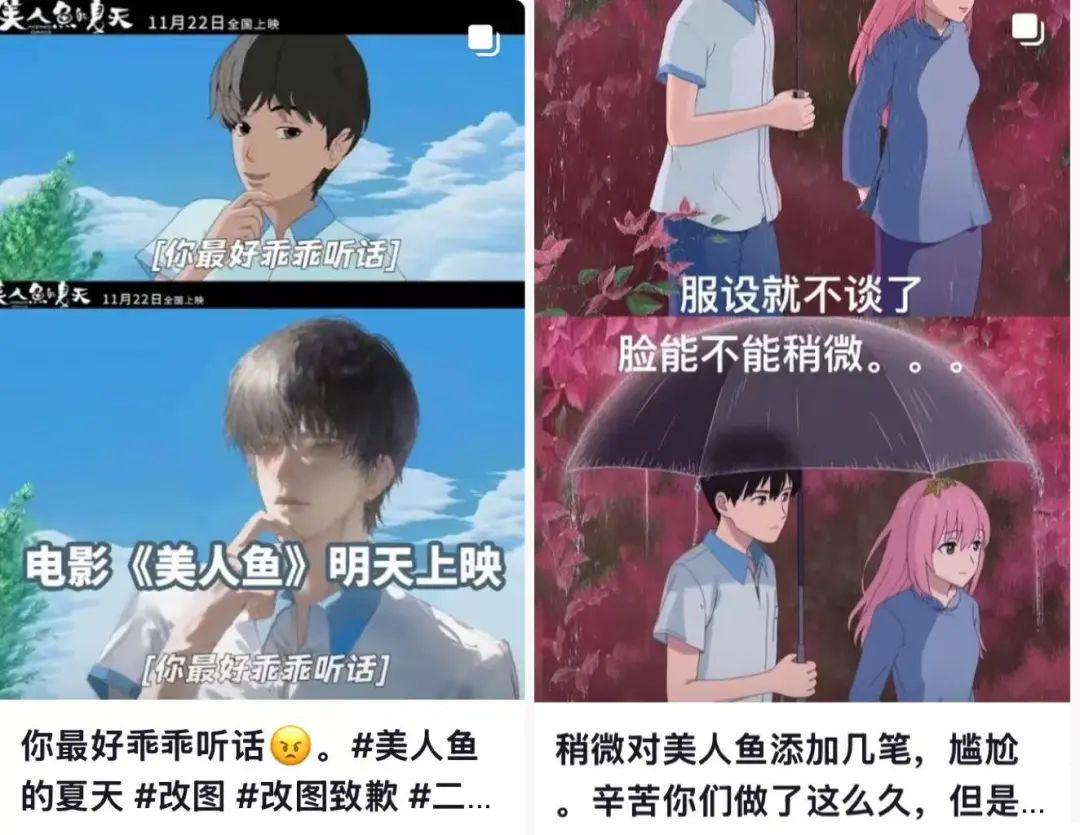 “感觉所有免费素材都用上了”,“第一次在动画片里看出演技差”,粗糙的人物外形与动作,略显出戏的配音,观众敏锐捕捉到电影存在的问题。从细微片段到整部动画,不尽人意的影片表现使得观众给予《美人鱼的夏天》“国产动画烂片”的头衔。