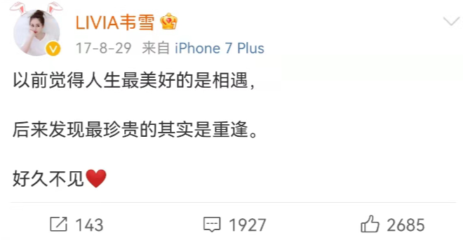 对于这段故事,韦雪并未公开认证或否认,只侧面印证了一些细节,比如2016年到2017年,有近一年的时间,她消失在互联网上。