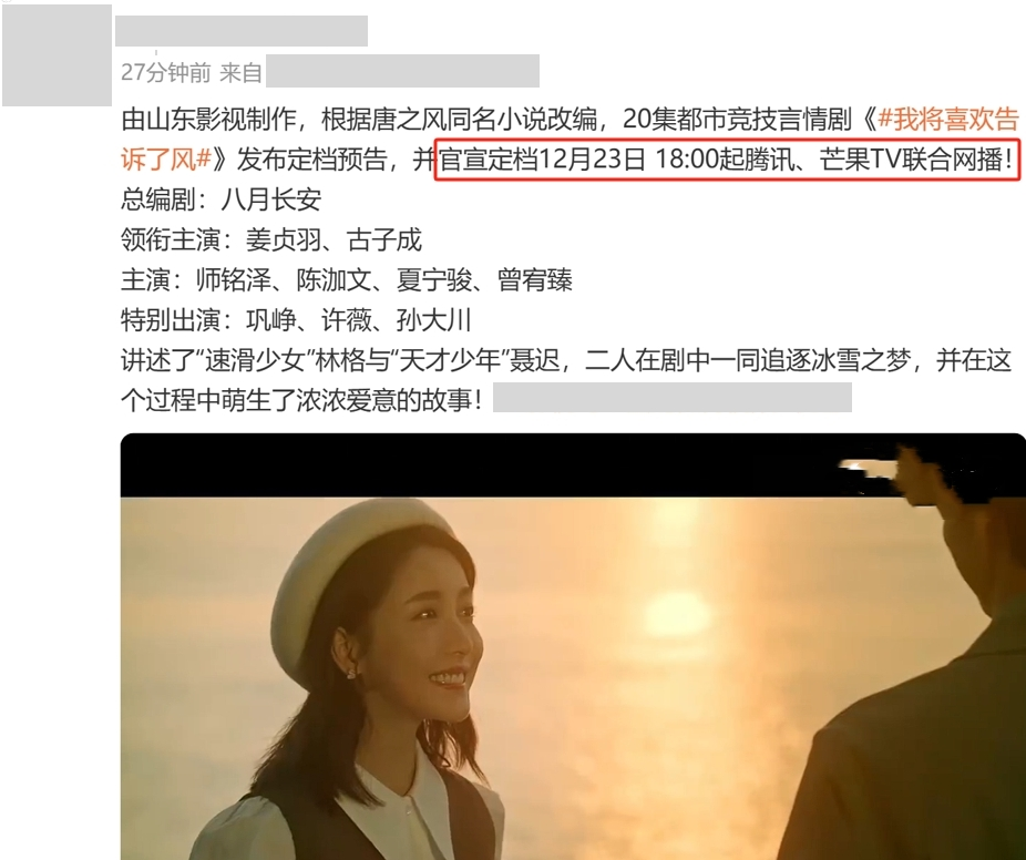 《我将喜欢告诉了风》将于12月23日在鹅厂与芒果联合播出。