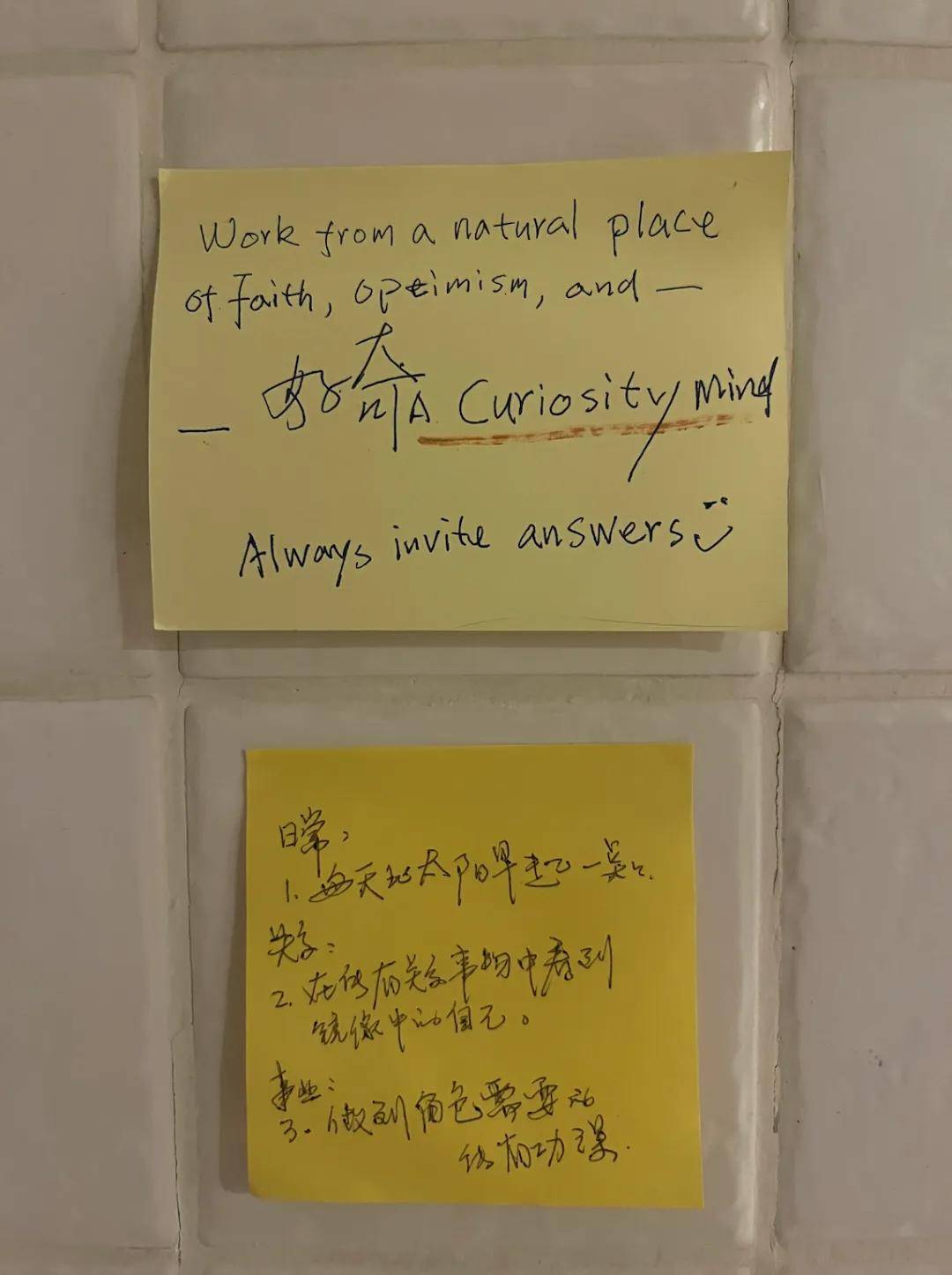 韦唯在家中贴的小纸条,提醒自己。日常:每天比太阳早起一点;关系:在所有关系事物中看到镜像中的自己;事业:做到角色需要的所有功课