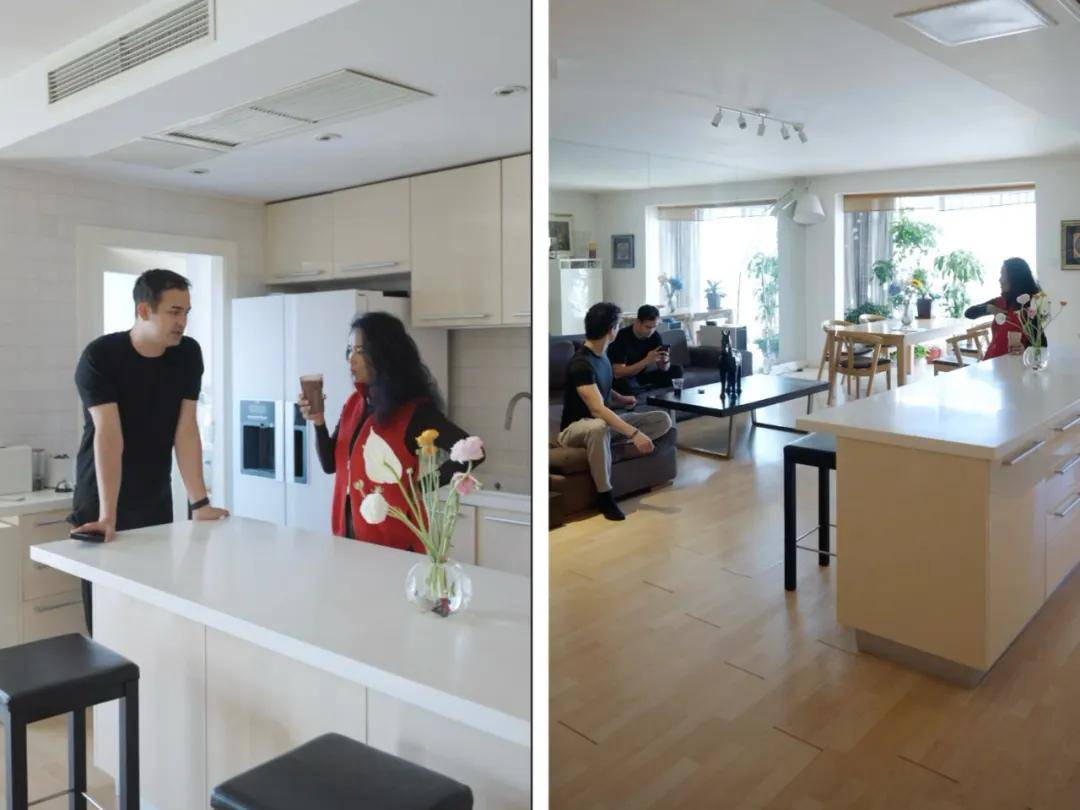 但是又有中国元素,一进门的玄关,做成像老北京窗户的感觉。客厅一整面是大镜子,我打小就是在练功房里头长大的,把上把下地练功。厨房做成开放式,有一个大岛台,我喜欢一家子围在这儿包饺子,圣诞节一起烤鸡。