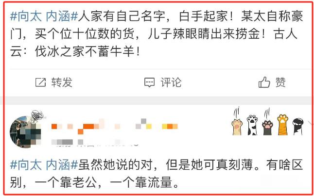 虽然向太没有说完后半句,但大家都知道,这句话的后半句是——臭不要脸。