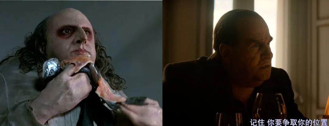 再说《企鹅人》剧。自始至终阿尔贝托的妹妹索菲娅被家族当成"疯子",而在《教父》中,麦克的妹妹康妮同样被家族认定为"精神不稳定"。更明显的致敬还有有法尔科内家族不想让索菲娅参与事务而将她关在门外的镜头,而《教父》中,科里昂家族也有把麦克的妻子凯拒之门外的场景。