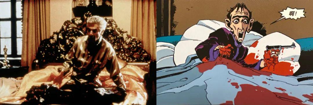 先说DC漫画。不知道你有没有注意,早在《新蝙蝠侠》就引用了《教父》插曲《I Have But One Heart》 (教父义子强尼·方亭所唱) 。《企鹅人》被杀的阿尔贝托·法尔科内,在2002年出版的DC漫画《蝙蝠侠:黑暗胜利》中被死亡威胁是检查官情人的尸体;而在《教父》中,不给强尼·方亭机会的制片人则是被马头吓醒——