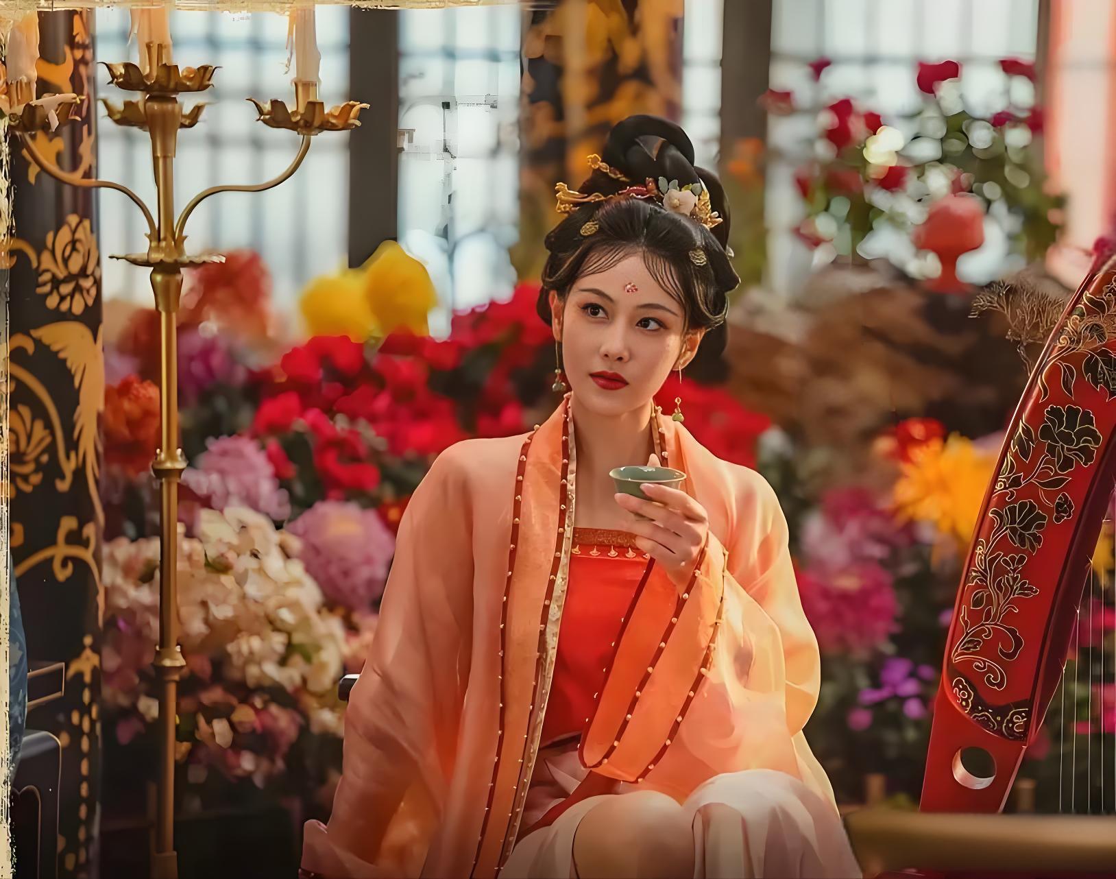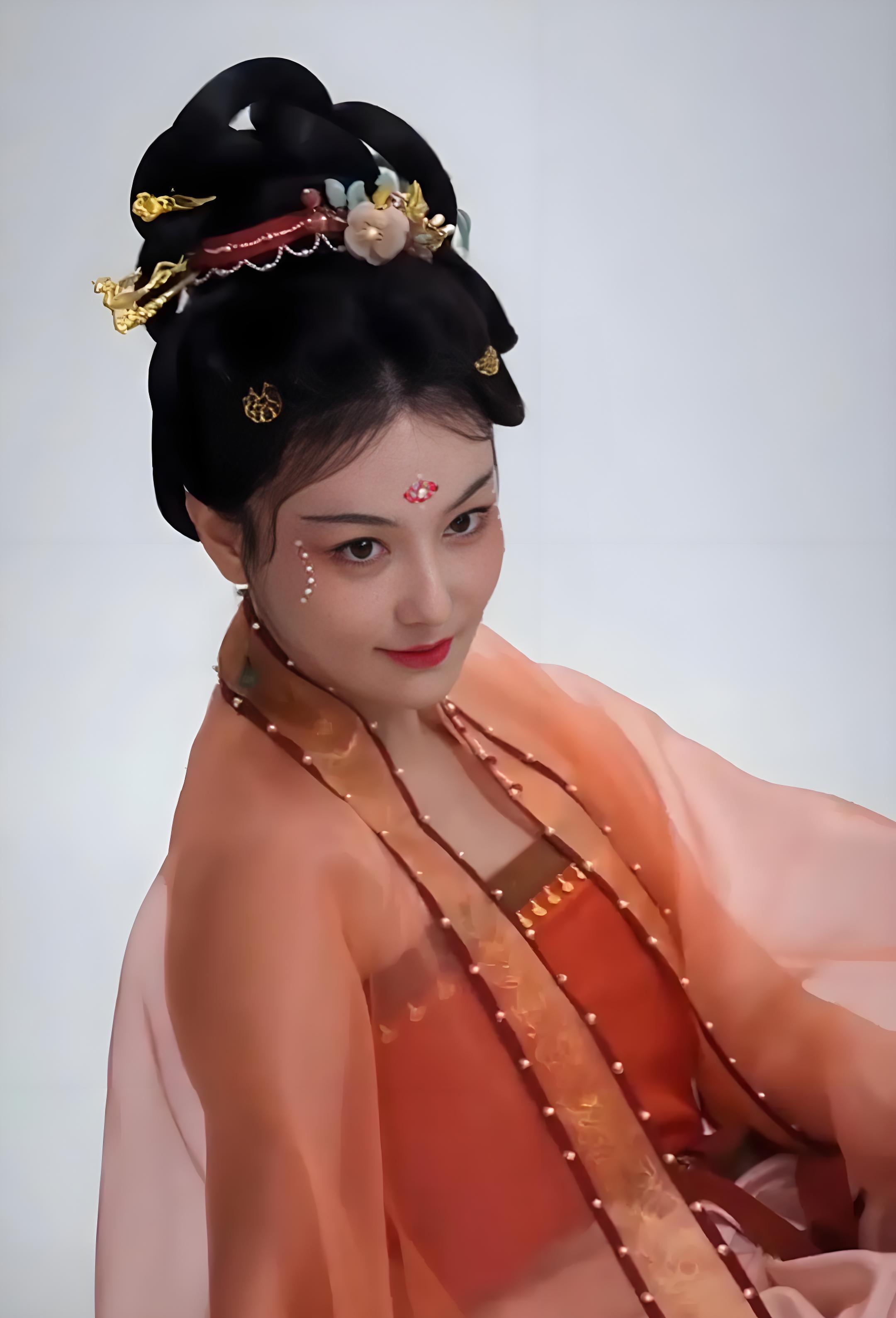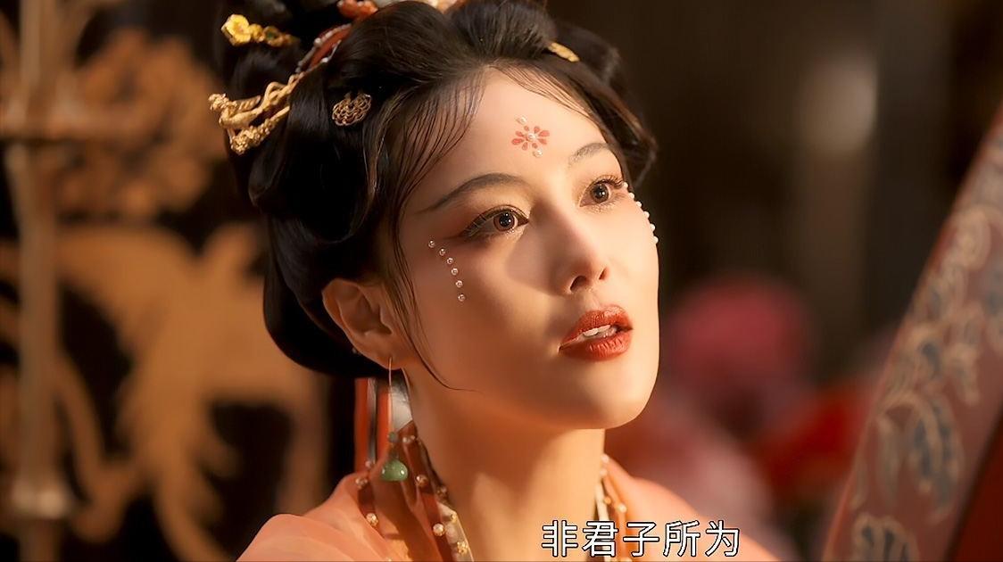 她的额头上有着精美的艳红色花钿,再搭配上远山黛眉更是增添了几分韵味。