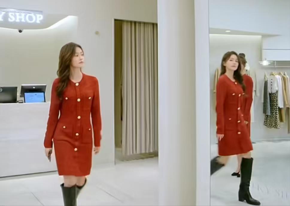 经典名场面里穿着红色小香风外套,因为太过绝美,惹得前男友后悔地咽口水。