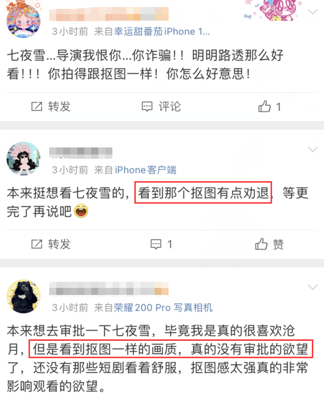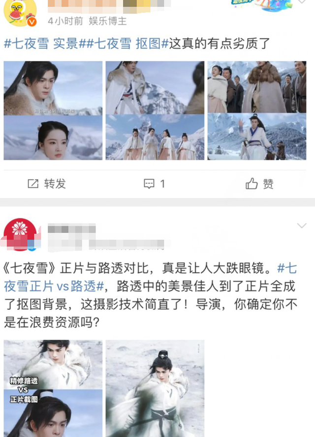 其实古偶剧用抠图在所难免,但偶尔用一下就行了,但《七夜雪》这次一开播,就因为抠图画面太集中,完全影响了看剧体验,劝退了不少的观众,差评一片,所以还是希望圈内的导演们能引以为戒,想要做出一部好的作品来,不光要靠演员们,方方面面都得用心才行!