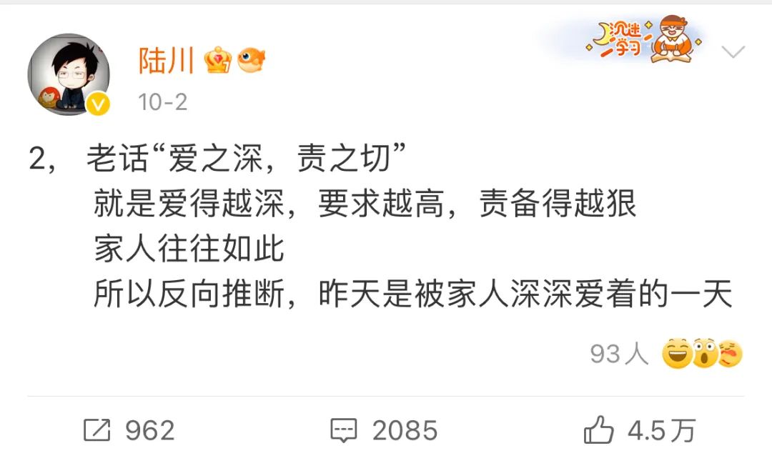 闹完这么一出,陆川自己的“低质强碱性不搞笑片”上映了,在一片骂声中他或许知道到底谁才是文化的悲哀了,于是,他只能一边阴阳怪气,一边义正言辞,面对批评,他说泥浆浴超爽,说爱之深责之切,所以自己被家人深深爱着。