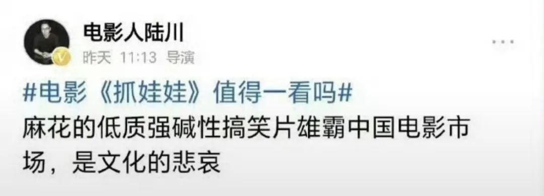 比起电影本身,陆川从暑期档到十一档的一系列行为艺术表演要精彩太多。《抓娃娃》上映后,他发文称《抓娃娃》是“低质强碱性搞笑片”,是“文化的悲哀”,引起热议后,陆川一方声称自己被盗号了,说老沈是哥们儿,小史是亲弟,相关信息是不实的,结果平台瞬间打脸,表示盗号是不存在的,内容是陆川自己发的,之后删了也是自己心虚删的。