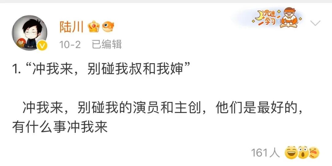 最经典是这么一条:冲我来,别碰我的演员和主创,他们是最好的,有什么事冲我来。