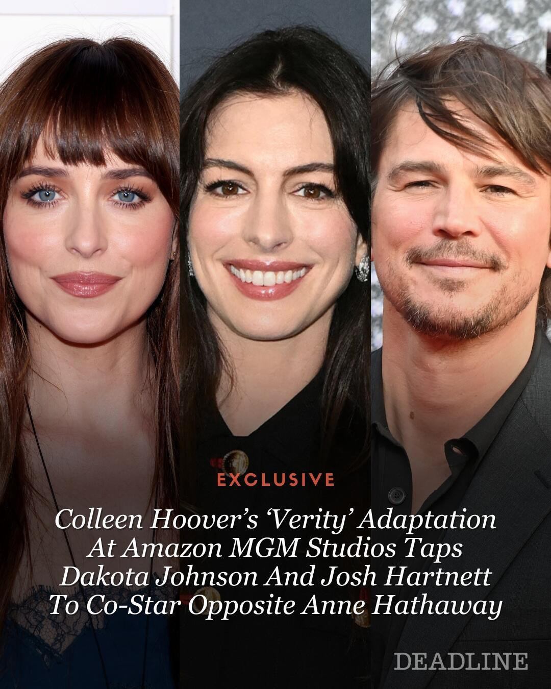 据外媒报道,安妮海瑟薇正在运作的其中一部新片《不存在的罪人》(Verity)追加达妹达科塔约翰逊、乔什哈奈特主演。影片根据美国短视频网站小说王者科琳胡佛(《爱情,到此为止》)的同名畅销悬疑爱情小说改编,由《对你的想象》导演迈克尔肖沃特执导,尼克安托斯卡撰写剧本。达妹饰演洛温,哈奈特饰演海瑟薇的丈夫杰瑞米。