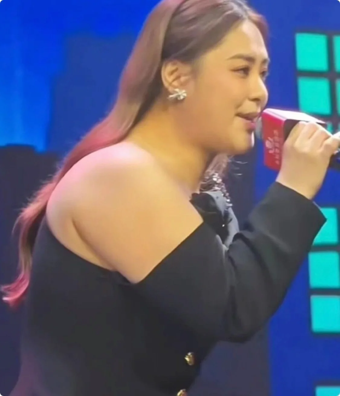 在网友晒出的演唱会片段中,阿娇大变样,穿着蓝色公主裙的阿娇在大屏幕上像充气的馒头,虽然五官骨相还在,但是脸大了一圈,一字肩的礼裙暴露了她肩宽背厚的身材问题,本应该走美艳路线的阿娇,如今显得憨态十足,笑起来更像是卡通人物。
