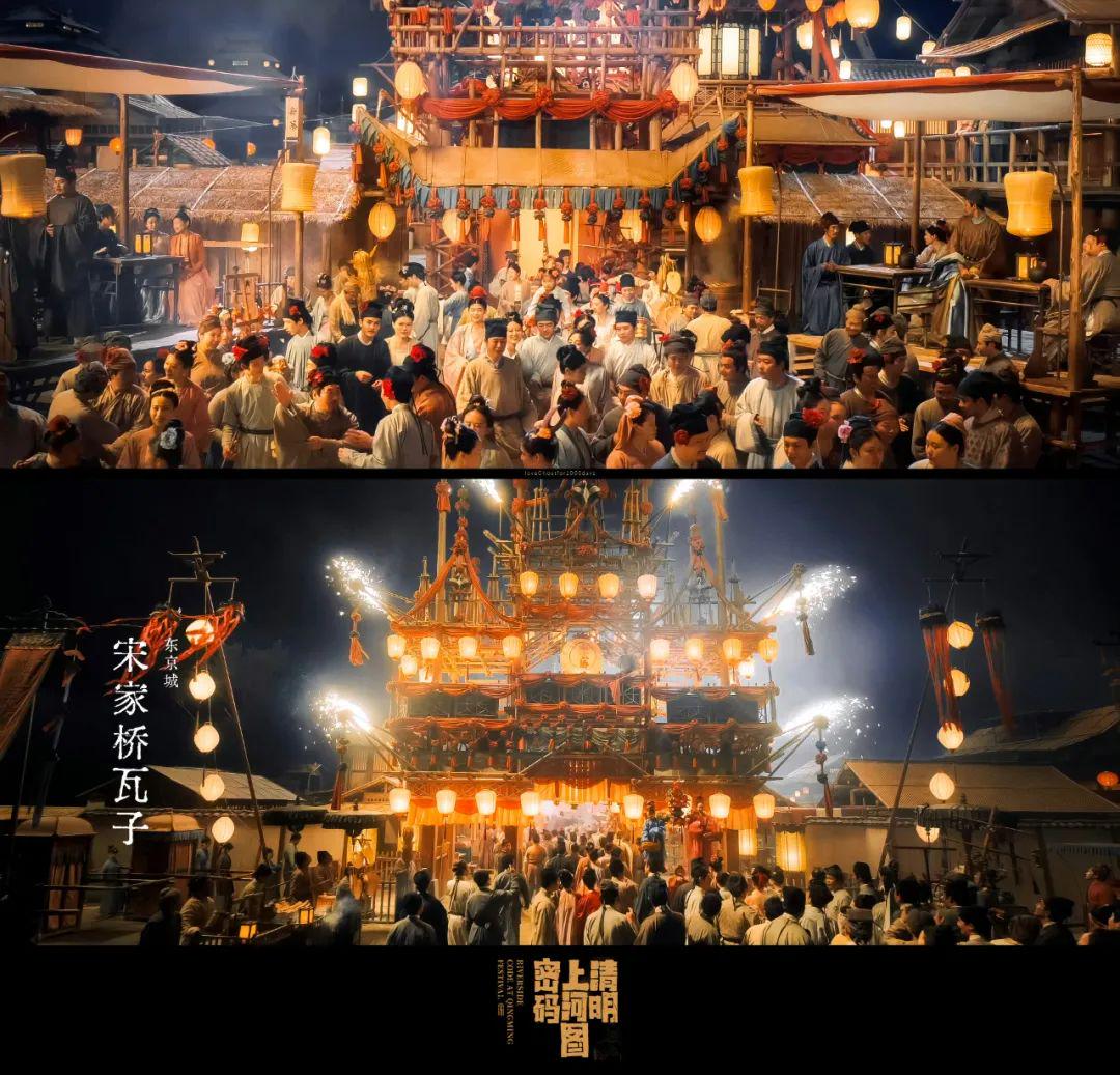 值得一提的是,剧集在制作方面也同样匠心打磨。为了呈现出尽量真实的宋朝,剧组耗时247天搭建了8万平方米的场景,复原了原画里的152个建筑以及河道、桥梁和船只等。剧中置景大到城市布局、建筑的风格样式,小到店铺招牌、人物的服饰装扮,无一不让北宋年间的盛景跃然眼前。只为让观众在观剧的同时仿佛身处宋朝市井之中,跨越千年去感受那份历史韵味和文化辉煌。
