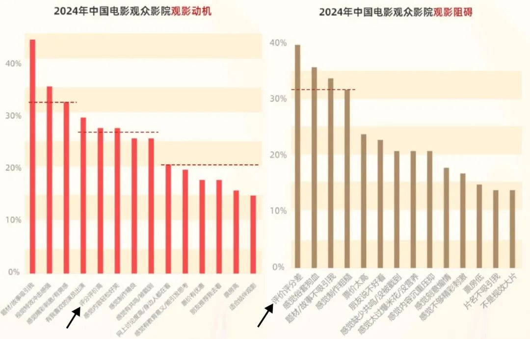 曾经,评分是电影观众进影院观影的主要动机。如今,据灯塔研究院发布的《2024中国电影观众变化趋势报告》,评价评分高并不是电影观众影院观影的主要动机,题材/故事有吸引力、视觉特效冲击感强、感觉精彩刺激有爽感、有喜欢的演员,在观影动机中占比都高于评分因素,但评价评分差,却是电影观众进影院观影的最大阻碍,占比高达40%。